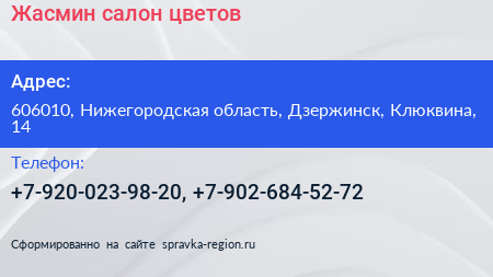Жасмин, салон цветов по адресу 606010, Нижегородская область, Дзержинск, Клюквина, 14 в дальнейшем Организация, размещена в следующих категориях: