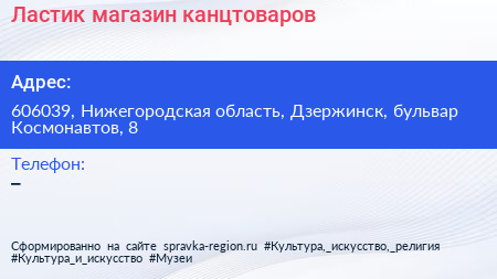 Ластик, магазин канцтоваров по адресу 606039, Нижегородская область, Дзержинск, бульвар Космонавтов, 8 в дальнейшем Организация, размещена в следующих категориях: