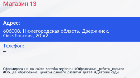 Магазин №13 по адресу 606008, Нижегородская область, Дзержинск, Октябрьская, 20 к2 в дальнейшем Организация, размещена в следующих категориях: