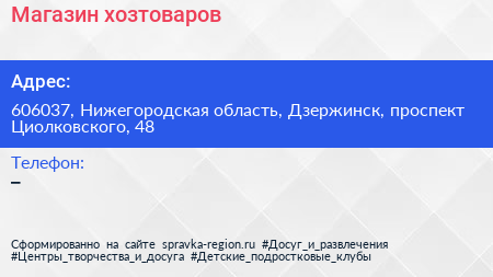 Магазин хозтоваров по адресу 606037, Нижегородская область, Дзержинск, проспект Циолковского, 48 в дальнейшем Организация, размещена в следующих категориях:
