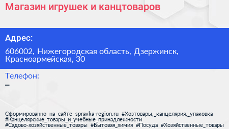 Магазин игрушек и канцтоваров по адресу 606002, Нижегородская область, Дзержинск, Красноармейская, 30 в дальнейшем Организация, размещена в следующих категориях: