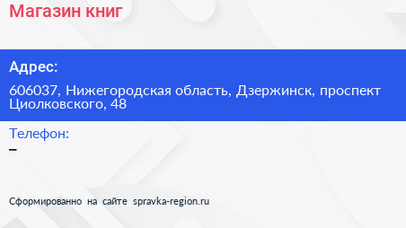 Магазин книг по адресу 606037, Нижегородская область, Дзержинск, проспект Циолковского, 48 в дальнейшем Организация, размещена в следующих категориях: