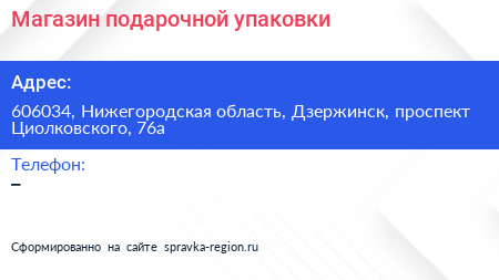 Магазин подарочной упаковки по адресу 606034, Нижегородская область, Дзержинск, проспект Циолковского, 76а в дальнейшем Организация, размещена в следующих категориях: