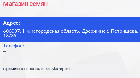 Магазин семян по адресу 606037, Нижегородская область, Дзержинск, Петрищева, 18/39 в дальнейшем Организация, размещена в следующих категориях:
