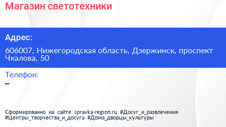 Магазин светотехники по адресу 606007, Нижегородская область, Дзержинск, проспект Чкалова, 50 в дальнейшем Организация, размещена в следующих категориях:
