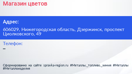 Магазин цветов по адресу 606029, Нижегородская область, Дзержинск, проспект Циолковского, 49 в дальнейшем Организация, размещена в следующих категориях: