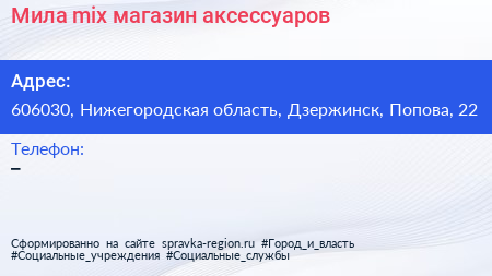 Мила mix, магазин аксессуаров по адресу 606030, Нижегородская область, Дзержинск, Попова, 22 в дальнейшем Организация, размещена в следующих категориях: