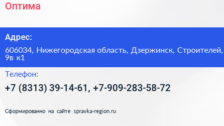 Оптима по адресу 606034, Нижегородская область, Дзержинск, Строителей, 9в к1 в дальнейшем Организация, размещена в следующих категориях: