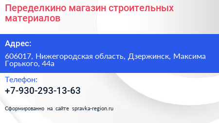 Переделкино, магазин строительных материалов по адресу 606017, Нижегородская область, Дзержинск, Максима Горького, 44а в дальнейшем Организация, размещена в следующих категориях: