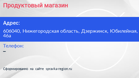 Продуктовый магазин по адресу 606040, Нижегородская область, Дзержинск, Юбилейная, 46а в дальнейшем Организация, размещена в следующих категориях: