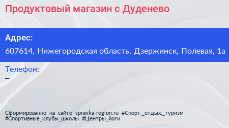 Продуктовый магазин, с. Дуденево по адресу 607614, Нижегородская область, Дзержинск, Полевая, 1а в дальнейшем Организация, размещена в следующих категориях: