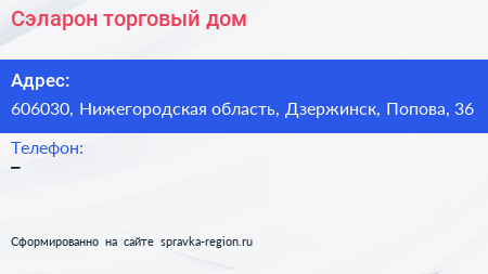 Сэларон, торговый дом по адресу 606030, Нижегородская область, Дзержинск, Попова, 36 в дальнейшем Организация, размещена в следующих категориях: