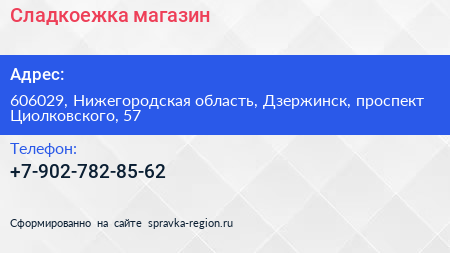 Сладкоежка, магазин по адресу 606029, Нижегородская область, Дзержинск, проспект Циолковского, 57 в дальнейшем Организация, размещена в следующих категориях: