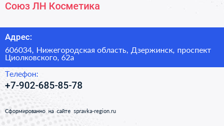 Союз ЛН-Косметика по адресу 606034, Нижегородская область, Дзержинск, проспект Циолковского, 62а в дальнейшем Организация, размещена в следующих категориях: