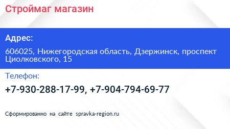 Строймаг, магазин по адресу 606025, Нижегородская область, Дзержинск, проспект Циолковского, 15 в дальнейшем Организация, размещена в следующих категориях: