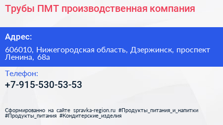 Трубы ПМТ, производственная компания по адресу 606010, Нижегородская область, Дзержинск, проспект Ленина, 68а в дальнейшем Организация, размещена в следующих категориях:
