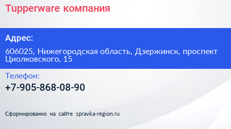 Tupperware, компания по адресу 606025, Нижегородская область, Дзержинск, проспект Циолковского, 15 в дальнейшем Организация, размещена в следующих категориях: