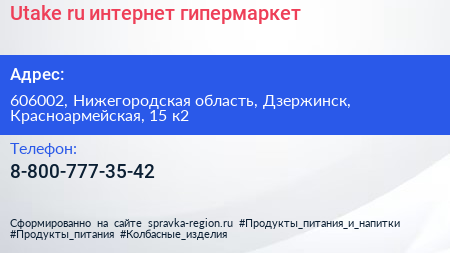 Utake.ru, интернет-гипермаркет по адресу 606002, Нижегородская область, Дзержинск, Красноармейская, 15 к2 в дальнейшем Организация, размещена в следующих категориях:
