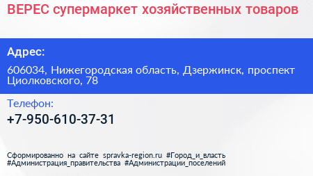 ВЕРЕС, супермаркет хозяйственных товаров по адресу 606034, Нижегородская область, Дзержинск, проспект Циолковского, 78 в дальнейшем Организация, размещена в следующих категориях: