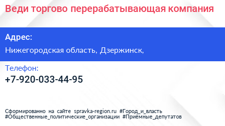 Веди, торгово-перерабатывающая компания по адресу Нижегородская область, Дзержинск, в дальнейшем Организация, размещена в следующих категориях: