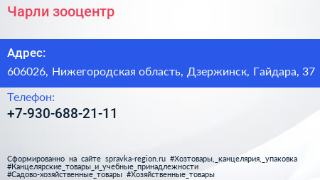 Чарли, зооцентр по адресу 606026, Нижегородская область, Дзержинск, Гайдара, 37 в дальнейшем Организация, размещена в следующих категориях:
