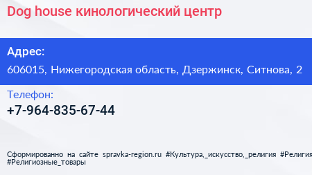 Dog house, кинологический центр по адресу 606015, Нижегородская область, Дзержинск, Ситнова, 2 в дальнейшем Организация, размещена в следующих категориях: