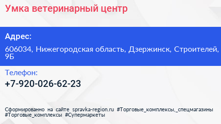 Умка, ветеринарный центр по адресу 606034, Нижегородская область, Дзержинск, Строителей, 9Б в дальнейшем Организация, размещена в следующих категориях: