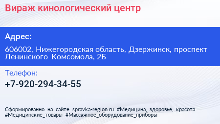 Вираж, кинологический центр по адресу 606002, Нижегородская область, Дзержинск, проспект Ленинского Комсомола, 2Б в дальнейшем Организация, размещена в следующих категориях: