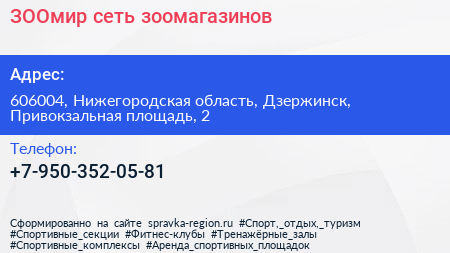ЗООмир, сеть зоомагазинов по адресу 606004, Нижегородская область, Дзержинск, Привокзальная площадь, 2 в дальнейшем Организация, размещена в следующих категориях: