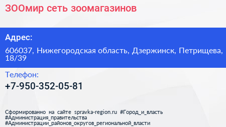 ЗООмир, сеть зоомагазинов по адресу 606037, Нижегородская область, Дзержинск, Петрищева, 18/39 в дальнейшем Организация, размещена в следующих категориях: