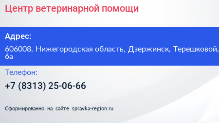 Центр ветеринарной помощи по адресу 606008, Нижегородская область, Дзержинск, Терешковой, 6а в дальнейшем Организация, размещена в следующих категориях: