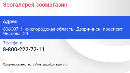 Зоогалерея, зоомагазин по адресу 606007, Нижегородская область, Дзержинск, проспект Чкалова, 24 в дальнейшем Организация, размещена в следующих категориях: