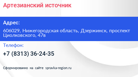 Артезианский источник по адресу 606029, Нижегородская область, Дзержинск, проспект Циолковского, 47в в дальнейшем Организация, размещена в следующих категориях:
