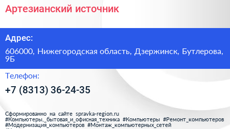 Артезианский источник по адресу 606000, Нижегородская область, Дзержинск, Бутлерова, 9Б в дальнейшем Организация, размещена в следующих категориях: