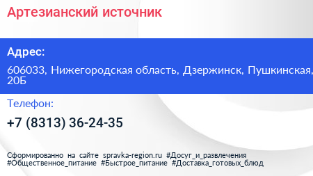 Артезианский источник по адресу 606033, Нижегородская область, Дзержинск, Пушкинская, 20Б в дальнейшем Организация, размещена в следующих категориях: