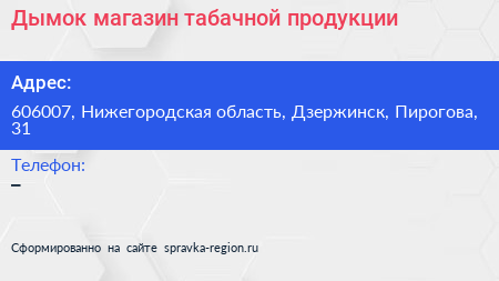 Дымок, магазин табачной продукции по адресу 606007, Нижегородская область, Дзержинск, Пирогова, 31 в дальнейшем Организация, размещена в следующих категориях: