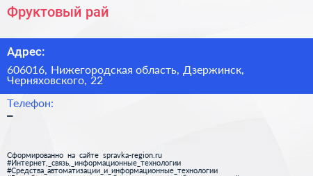 Фруктовый рай по адресу 606016, Нижегородская область, Дзержинск, Черняховского, 22 в дальнейшем Организация, размещена в следующих категориях: