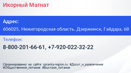 Икорный Магнат по адресу 606025, Нижегородская область, Дзержинск, Гайдара, 68 в дальнейшем Организация, размещена в следующих категориях: