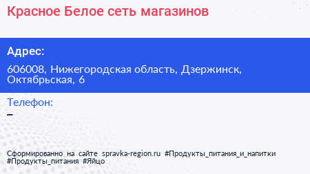 Красное & Белое, сеть магазинов по адресу 606008, Нижегородская область, Дзержинск, Октябрьская, 6 в дальнейшем Организация, размещена в следующих категориях: