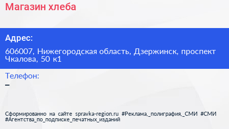 Магазин хлеба по адресу 606007, Нижегородская область, Дзержинск, проспект Чкалова, 50 к1 в дальнейшем Организация, размещена в следующих категориях: