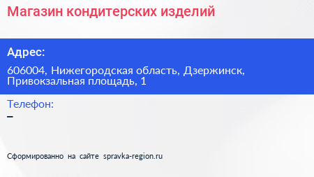 Магазин кондитерских изделий по адресу 606004, Нижегородская область, Дзержинск, Привокзальная площадь, 1 в дальнейшем Организация, размещена в следующих категориях: