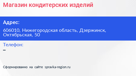 Магазин кондитерских изделий по адресу 606010, Нижегородская область, Дзержинск, Октябрьская, 50 в дальнейшем Организация, размещена в следующих категориях: