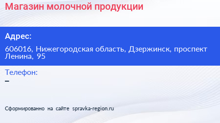 Магазин молочной продукции по адресу 606016, Нижегородская область, Дзержинск, проспект Ленина, 95 в дальнейшем Организация, размещена в следующих категориях:
