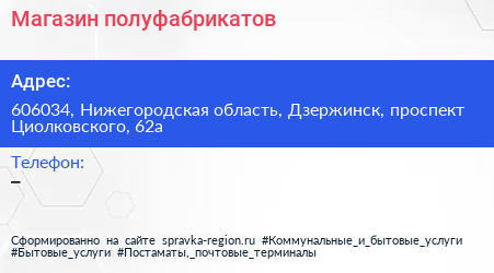 Магазин полуфабрикатов по адресу 606034, Нижегородская область, Дзержинск, проспект Циолковского, 62а в дальнейшем Организация, размещена в следующих категориях: