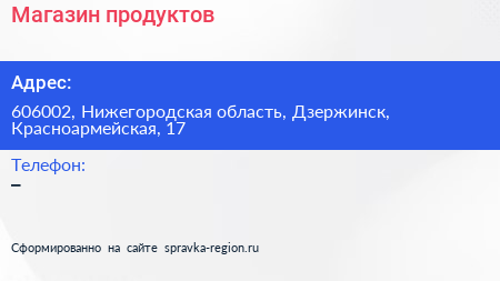 Магазин продуктов по адресу 606002, Нижегородская область, Дзержинск, Красноармейская, 17 в дальнейшем Организация, размещена в следующих категориях: