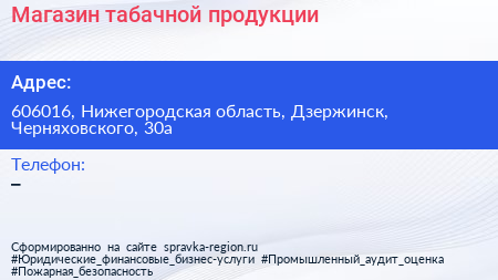Магазин табачной продукции по адресу 606016, Нижегородская область, Дзержинск, Черняховского, 30а в дальнейшем Организация, размещена в следующих категориях:
