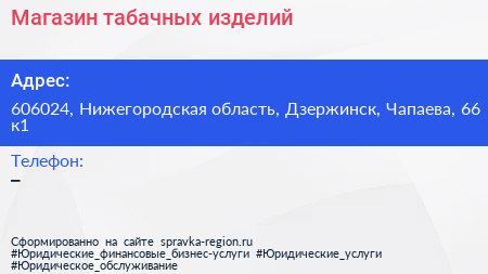 Магазин табачных изделий по адресу 606024, Нижегородская область, Дзержинск, Чапаева, 66 к1 в дальнейшем Организация, размещена в следующих категориях: