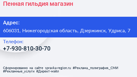 Пенная гильдия, магазин по адресу 606031, Нижегородская область, Дзержинск, Удриса, 7 в дальнейшем Организация, размещена в следующих категориях: