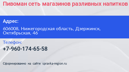 Пивоман, сеть магазинов разливных напитков по адресу 606008, Нижегородская область, Дзержинск, Октябрьская, 46 в дальнейшем Организация, размещена в следующих категориях: