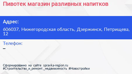 Пивотек, магазин разливных напитков по адресу 606037, Нижегородская область, Дзержинск, Петрищева, 12 в дальнейшем Организация, размещена в следующих категориях:
